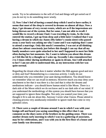 13. There were a couple of dreams around 3 am in which I was with your benign self and heard you saying something to this effect that I can comment on the diary notes of the brothers in the guiding sense. There was another dream early morning in which I was in a gathering of associates, may be for celebrations, and I was with you in the first floor of a house and your family was downstairs.