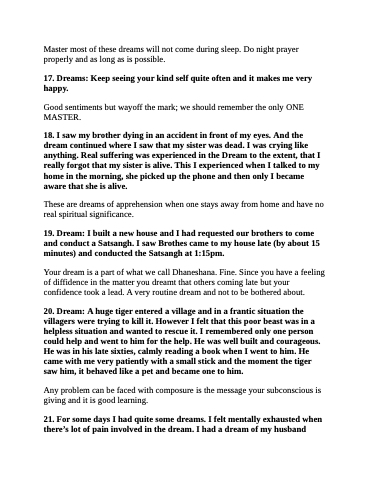 20. Dream: A huge tiger entered a village and in a frantic situation the villagers were trying to kill it. However I felt that this poor beast was in a helpless situation and wanted to rescue it. I remembered only one person could help and went to him for the help. He was well built and courageous. He was in his late sixties, calmly reading a book when I went to him. He came with me very patiently with a small stick and the moment the tiger saw him, it behaved like a pet and became one to him.