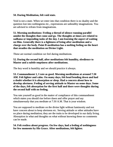54. Felt restless about progress. On few days, had a feeling of nothingness for few moments by His Grace. After meditations, felt lighter.