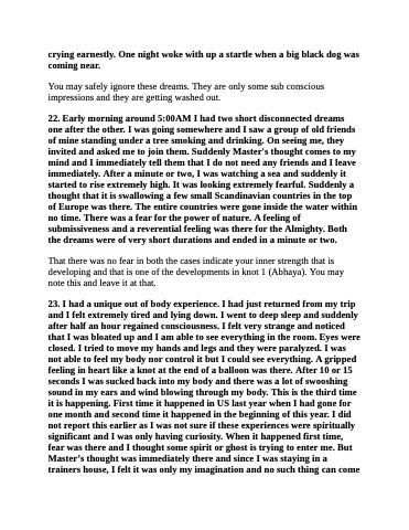 23. I had a unique out of body experience. I had just returned from my trip and I felt extremely tired and lying down. I went to deep sleep and suddenly after half an hour regained consciousness. I felt very strange and noticed that I was bloated up and I am able to see everything in the room. Eyes were closed. I tried to move my hands and legs and they were paralyzed. I was not able to feel my body nor control it but I could see everything. A gripped feeling in heart like a knot at the end of a balloon was there. After 10 or 15 seconds I was sucked back into my body and there was a lot of swooshing sound in my ears and wind blowing through my body. This is the third time it is happening. First time it happened in US last year when I had gone for one month and second time it happened in the beginning of this year. I did not report this earlier as I was not sure if these experiences were spiritually significant and I was only having curiosity. When it happened first time, fear was there and I thought some spirit or ghost is trying to enter me. But Master’s thought was immediately there and since I was staying in a trainers house, I felt it was only my imagination and no such thing can come
