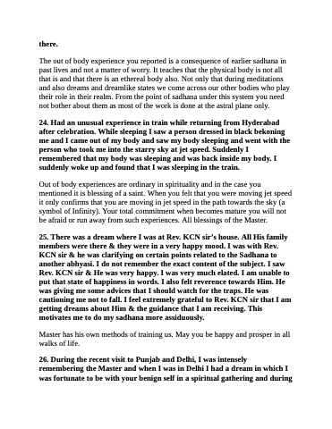25. There was a dream where I was at Rev. KCN sir’s house. All His family members were there & they were in a very happy mood. I was with Rev. KCN sir & he was clarifying on certain points related to the Sadhana to another abhyasi. I do not remember the exact content of the subject. I saw Rev. KCN sir & He was very happy. I was very much elated. I am unable to put that state of happiness in words. I also felt reverence towards Him. He was giving me some advices that I should watch for the traps. He was cautioning me not to fall. I feel extremely grateful to Rev. KCN sir that I am getting dreams about Him & the guidance that I am receiving. This motivates me to do my sadhana more assiduously.