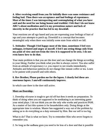 4. After receiving email from you Sir initially there was some resistance and feeling bad. Then there was acceptance and had feelings of repentance. Most of the times I was introspecting and contemplating of what you have said and the need for me being honest and truthful. I felt that I do not know ABC’s about meditation and it is my pretentious nature and lack of sincerity in the practice that has led to my downfall.