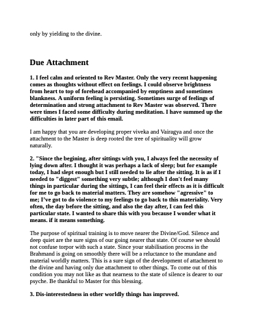 1. I feel calm and oriented to Rev Master. Only the very recent happening comes as thoughts without effect on feelings. I could observe brightness from heart to top of forehead accompanied by emptiness and sometimes blankness. A uniform feeling is persisting. Sometimes surge of feelings of determination and strong attachment to Rev Master was observed. There were times I faced some difficulty during meditation. I have summed up the difficulties in later part of this email.