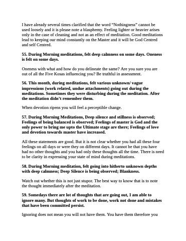 I have already several times clarified that the word “Nothingness” cannot be used loosely and it is please note a blasphemy. Feeling lighter or heavier arises only in the case of cleaning and not as an effect of meditation. Good meditations lead to keeping our mind constantly on the Master and it will be God Centred and self Centred.