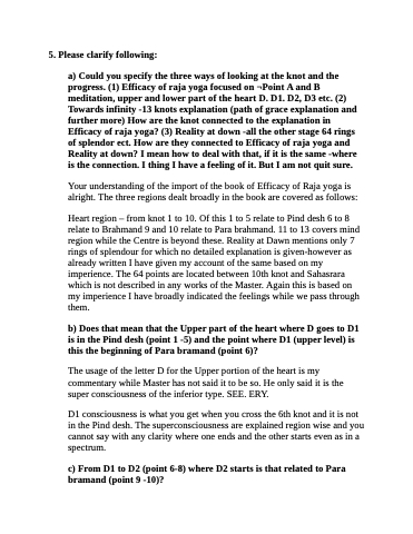 a) Could you specify the three ways of looking at the knot and the progress. (1) Efficacy of raja yoga focused on ¬Point A and B meditation, upper and lower part of the heart D. D1. D2, D3 etc. (2) Towards infinity -13 knots explanation (path of grace explanation and further more) How are the knot connected to the explanation in Efficacy of raja yoga? (3) Reality at down -all the other stage 64 rings of splendor ect. How are they connected to Efficacy of raja yoga and Reality at down? I mean how to deal with that, if it is the same -where is the connection. I thing I have a feeling of it. But I am not quit sure.
