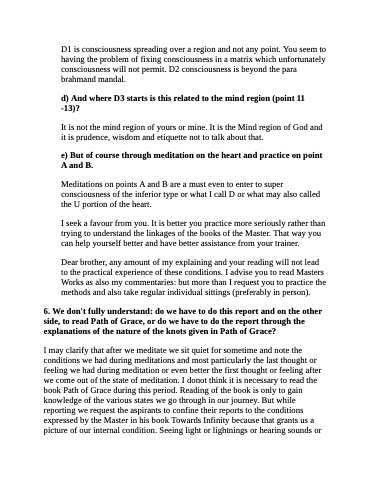 I may clarify that after we meditate we sit quiet for sometime and note the conditions we had during meditations and most particularly the last thought or feeling we had during meditation or even better the first thought or feeling after we come out of the state of meditation. I donot think it is necessary to read the book Path of Grace during this period. Reading of the book is only to gain knowledge of the various states we go through in our journey. But while reporting we request the aspirants to confine their reports to the conditions expressed by the Master in his book Towards Infinity because that grants us a picture of our internal condition. Seeing light or lightnings or hearing sounds or