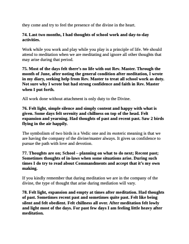 76. Felt light, simple silence and simply content and happy with what is given. Some days felt serenity and chillness on top of the head. Felt expansion and yearning. Had thoughts of past and recent past. Saw 2 birds flying in the air happily.