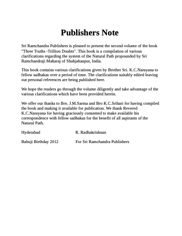 Sri Ramchandra Publishers is pleased to present the second volume of the book "Three Truths -Trillion Doubts". This book is a compilation of various clarifications regarding the system of the Natural Path propounded by Sri Ramchandraji Maharaj of Shahjahanpur, India.