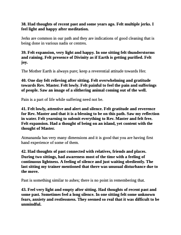 38. Had thoughts of recent past and some years ago. Felt multiple jerks. I feel light and happy after meditation.