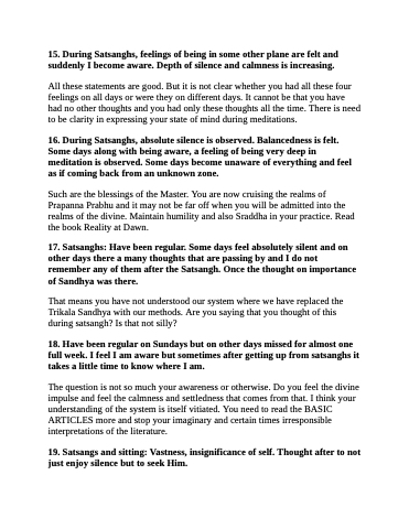 15. During Satsanghs, feelings of being in some other plane are felt and suddenly I become aware. Depth of silence and calmness is increasing.