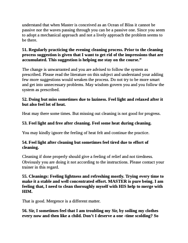 55. Cleanings: Feeling lightness and refreshing mostly. Trying every time to make it a stable and well concentrated effort. MASTER is pure being. I am feeling that, I need to clean thoroughly myself with HIS help to merge with HIM.