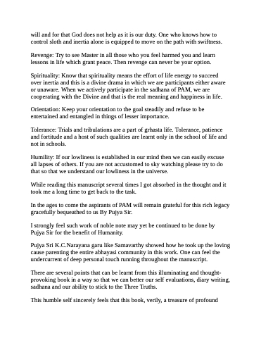 There are several points that can be learnt from this illuminating and thought- provoking book in a way so that we can better our self evaluations, diary writing, sadhana and our ability to stick to the Three Truths.
