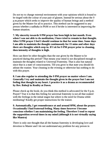 8. I am also regular to attending the 9 PM prayer no matter where I am. Generally I try and maintain the thought given in the prayer but I am not feeling that thought in my heart. I practice it as a drama as recommended by Rev. Babuji in Reality at Dawn.