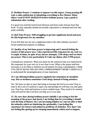15. Sir, now days during bedtime prayer initially I am trying to feel the meaning of the prayer and slowly I am feeling that for everything I should seek the help of Master. Sir, I am becoming helpless as I am not able to find the attitudes which are hindering the spirituality. I am feeling like repentance for known and unknown problems of attitudes. Now days I am not feeling like getting up for sleeping immediately which used to happen