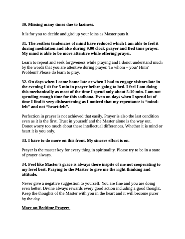 32. On days when I come home late or when I had to engage visitors late in the evening I sit for 5 min in prayer before going to bed. I feel I am doing this mechanically as most of the time I spend only about 5-10 min. I am not spending enough time for this sadhana. Even on days when I spend lot of time I find it very disheartening as I noticed that my repentance is “mind- felt” and not “heart-felt”.