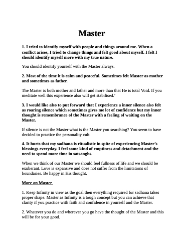 1. Keep Infinity in view as the goal then everything required for sadhana takes proper shape. Master as Infinity is a tough concept but you can achieve that clarity if you practice with faith and confidence in yourself and the Master.