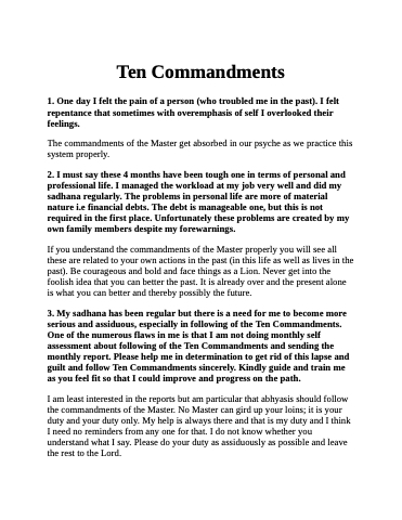 3. My sadhana has been regular but there is a need for me to become more serious and assiduous, especially in following of the Ten Commandments. One of the numerous flaws in me is that I am not doing monthly self assessment about following of the Ten Commandments and sending the monthly report. Please help me in determination to get rid of this lapse and guilt and follow Ten Commandments sincerely. Kindly guide and train me as you feel fit so that I could improve and progress on the path.