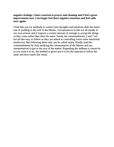 I find that you try methods to control your thoughts and emotions than the easier one of yielding to the will of the Master. Circumstances in life are all results of our own actions and it requires a certain amount of courage to accept the things as they come rather than alter the same. Surely the commandments 5 and 7 are not all that easy to follow as they are aimed at controlling lower order emotional tendencies. But following them only can be called sanity. Kindly read the commandments by duly studying the commentaries of the Master and our interpretations to get to the root of the matter. Regarding the sadhana it cannot be as you want it to be, the method is given and it is for the aspirant to follow the same and then expect the result.