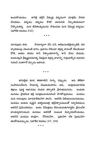 భ గ వ త క డ శ ర ణ గ గ ె ప న ు . అ ే క ా సంాం పలగ ామన షయమాదు. అ, ఇంయ మనిక శకల పర అవమ ంెన తాత ారంభమగను. ఇందుక మనమ ా థక భ సూతమ లనుసం ా వదుమ. మనమ మన గరవను మనాతా తల, అత యే లమగదుమ. మనమ ఆయన దృి ఆకం చుట భాసమల సరధమల అత ంెదమ. ఇందు తమ వ లమనుకలర ా పంక బంధవరపమన మనమ అత సంబంధ రరచుందుమ. అత మనమ తం ా, దరా, పభ ా లక యి ా తల యవచును. (మక రచనల 317, 318)