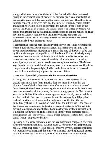 energy which was in very subtle form of the first mind has been rendered finally in the grossest form of matter. The outward process of manifestation has been the same both for man and the rest of the universe. Thus there is an intimate connection between man and the universe. If man becomes subtler and subtler he will be able to comprehend the subtler forces at play in the universe and will be in a position to control them if so willed by Nature. Of course this implies that such a man has learned first to control himself and has become sufficiently subtle so that the inner workings of Nature are transparent to him. The Master says further that every point in the spinal column is filled with enormous power.