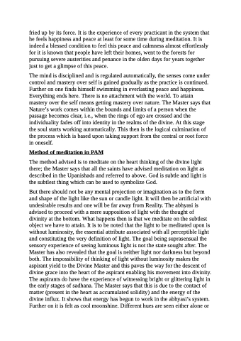 The method advised is to meditate on the heart thinking of the divine light there; the Master says that all the saints have advised meditation on light as described in the Upanishads and referred to above. God is subtle and light is the subtlest thing which can be used to symbolize God.