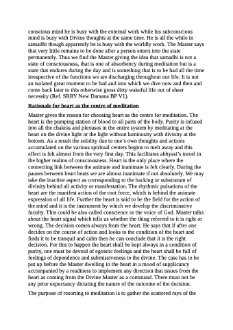 conscious mind he is busy with the external work while his subconscious mind is busy with Divine thoughts at the same time. He is all the while in samadhi though apparently he is busy with the worldly work. The Master says that very little remains to be done after a person enters into the state permanently. Thus we find the Master giving the idea that samadhi is not a state of consciousness, that is one of absorbency during meditation but is a state that endures during the day and is something that is to be had all the time irrespective of the functions we are discharging throughout our life. It is not an isolated great moment to be had and into which we dive now and then and come back later to this otherwise gross dirty wakeful life out of sheer necessity (Ref. SRRY New Darsana BP V1).