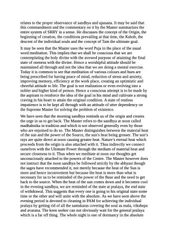 relates to the proper observance of sandhya and upasana. It may be said that this commandment and the commentary on it by the Master summarizes the entire system of SRRY in a sense. He discusses the concept of the Origin, the beginning of creation, the conditions prevailing at that time, the Kshob, the descent of the individual souls and the concept of Tam the ultimate goal.