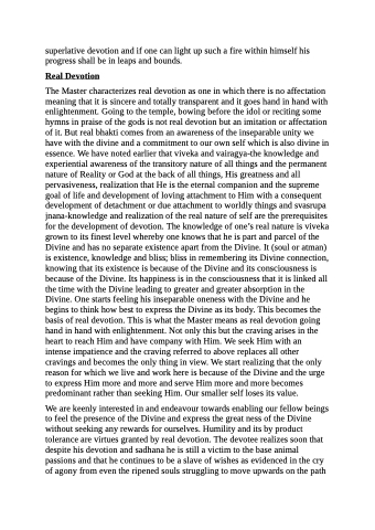 The Master characterizes real devotion as one in which there is no affectation meaning that it is sincere and totally transparent and it goes hand in hand with enlightenment. Going to the temple, bowing before the idol or reciting some hymns in praise of the gods is not real devotion but an imitation or affectation of it. But real bhakti comes from an awareness of the inseparable unity we have with the divine and a commitment to our own self which is also divine in essence. We have noted earlier that viveka and vairagya-the knowledge and experiential awareness of the transitory nature of all things and the permanent nature of Reality or God at the back of all things, His greatness and all pervasiveness, realization that He is the eternal companion and the supreme goal of life and development of loving attachment to Him with a consequent development of detachment or due attachment to worldly things and svasrupa jnana-knowledge and realization of the real nature of self are the prerequisites for the development of devotion. The knowledge of one’s real nature is viveka grown to its finest level whereby one knows that he is part and parcel of the Divine and has no separate existence apart from the Divine. It (soul or atman) is existence, knowledge and bliss; bliss in remembering its Divine connection, knowing that its existence is because of the Divine and its consciousness is because of the Divine. Its happiness is in the consciousness that it is linked all the time with the Divine leading to greater and greater absorption in the Divine. One starts feeling his inseparable oneness with the Divine and he begins to think how best to express the Divine as its body. This becomes the basis of real devotion. This is what the Master means as real devotion going hand in hand with enlightenment. Not only this but the craving arises in the heart to reach Him and have company with Him. We seek Him with an intense impatience and the craving referred to above replaces all other cravings and becomes the only thing in view. We start realizing that the only reason for which we live and work here is because of the Divine and the urge to express Him more and more and serve Him more and more becomes predominant rather than seeking Him. Our smaller self loses its value.