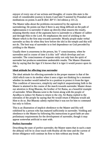 The Master talks about the problems encountered by the aspirant in surrendering; He points out that if there is any thing difficult on the path of righteousness it is surrender if taken up directly (that ensures the result), meaning thereby most of the aspirants have to surrender to a Master of caliber and through Him to the Lord. He emphasizes the need of yielding to the Master which is the first step towards surrender. Mostly people make verbal surrender as they do when they bow before the idol in the temple and this will not do. The best way of surrender is to feel dependence on God preceded by yielding to the Master.