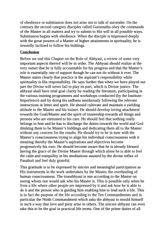 Before we end this Chapter on the Role of Abhyasi, a review of some very important aspects thereof will be in order. The Abhyasi should realize at the very outset that he is fully accountable for his progress and that the Master’s role is essentially one of support though he can not do without it ever. The Master states clearly that practice is the aspirant’s responsibility while spirituality is His responsibility. He says further that when we have played our part the Divine will never fail to play its part, which is Divine justice. The abhyasi shall have total goal clarity by reading the literature, participating in the various training programmes and workshops conducted (by the Institute- Imperience) and by doing his sadhana assiduously following the relevant instructions in letter and spirit. He should cultivate and maintain a yielding attitude to the Master and his trainer. He should develop loving attachment towards the Goal/Master and the spirit of trusteeship towards all things and persons who are entrusted to his care. He should feel that nothing really belongs to him and he has to discharge the duties towards the world and God thinking them to be Master’s biddings and dedicating them all to the Master without any concern for the results. He should try to be in tune with the Master’s consciousness trying to align his individual consciousness with it meaning thereby the Master’s aspirations and objectives become progressively his own. He should become aware that he is already blessed having the grace of the Divine Master through which alone he is able to feel the calm and tranquility in his meditations assisted by the divine influx of Panahuti and feel duly grateful.