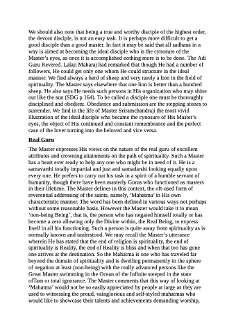 The Master expresses His views on the nature of the real guru of excellent attributes and crowning attainments on the path of spirituality. Such a Master has a heart ever ready to help any one who might be in need of it. He is a samavarthi totally impartial and just and samadarshi looking equally upon every one. He prefers to carry out his task in a spirit of a humble servant of humanity, though there have been masterly Gurus who functioned as masters in their lifetime. The Master defines in this context, the oft-used form of reverential addressing of the saints, namely, ‘Mahatma’ in His own characteristic manner. The word has been defined in various ways not perhaps without some reasonable basis. However the Master would take it to mean ‘non-being Being’, that is, the person who has negated himself totally or has become a zero allowing only the Divine within, the Real Being, to express Itself in all his functioning. Such a person is quite away from spirituality as is normally known and understood. We may recall the Master’s utterance wherein He has stated that the end of religion is spirituality, the end of spirituality is Reality, the end of Reality is bliss and when that too has gone one arrives at the destination. So the Mahatma is one who has traveled far beyond the domain of spirituality and is dwelling permanently in the sphere of negation at least (non-being) with the really advanced persons like the Great Master swimming in the Ocean of the Infinite steeped in the state ofTam or total ignorance. The Master comments that this way of looking at ‘Mahatma’ would not be so easily appreciated by people at large as they are used to witnessing the proud, vainglorious and self-styled mahatmas who would like to showcase their talents and achievements demanding worship,