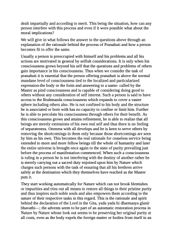Usually a person is preoccupied with himself and his problems and all his actions are motivated in general by selfish considerations. It is only when his consciousness grows beyond his self that the questions and problems of others gain importance in his consciousness. Thus when we consider the task of pranahuti it is essential that the person offering pranahuti is above the normal mundane level of consciousness tied to the localized and particularized expression-the body or the form and answering to a name- called by the Master as pind consciousness and is capable of considering doing good to others without any consideration of self interest. Such a person is said to have access to the Brahmanda consciousness which expands to cover a vaster sphere including others also. He is not confined to his body and the structure he is associated or born with has no capacity to confine or limit him. Further he is able to percolate his consciousness through others for their benefit. As this consciousness grows and attains refinement, he is able to realize that all beings are merely extensions of his own real self and thus there is no feeling of separateness. Oneness with all develops and he is keen to serve others by removing the shortcomings in them only because those shortcomings are seen by him as his own. This becomes the real rationale for ceaseless service being extended to more and more fellow beings till the whole of humanity and later the entire universe is brought once again to the state of purity prevailing just before the process of manifestation commenced. When such a consciousness is ruling in a person he is not interfering with the destiny of another rather he is merely carrying out a sacred duty enjoined upon him by Nature which charges such persons with the task of ensuring that all his brethren arrive safely at the destination which they themselves have reached as the Master puts it.