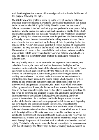 The third view of the goal is to come up to the level of leading a balanced existence- interested readers may refer to the detailed treatment of this aspect in the related article (BP V1 p 367-411). The Gita states that the state of balance or samatva is the hall mark of yoga and praises the wise person living in state of sthitha prajna, the state of spiritual equanimity highly. (Gita Ch.2). The Master has stated in His message, ‘Solution to the Problem of Existence’ (SDG p- 118-9) that when one ponders over the problem (the Destination), he will surely come to the conclusion that he is sailing towards his own Home wherefrom he has been snatched by the Irony of Fate. Explaining further the concept of the ‘Irony’, the Master says that it evokes the idea of ‘unbalanced character’. So long as one is in the balanced state he had no form of his own. The unbalanced character has created all the intricacies of existence and the way out is to unfold ourselves and restore our own balance which had been lost. The SRRY is the system which enables the sadhaka to recover the balanced state.