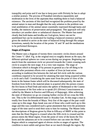 The Master uses a diagram of twenty three concentric circles drawn around the Centre ‘C’ (Ref. Fig. in the original text) to roughly denote as He says, the different spiritual spheres we come across during our progress. Beginning our march from the outermost circle we proceed towards the Centre crossing each circle to acquire the next stage. It is a very vast expanse. The stage of Liberation which is thought of by persons in general as a far off thing to be attained after persistent efforts over a number of lives (at least seven according to tradition) lies between the 2nd and 3rd circle with the various conditions required to be secured for attaining that state being acquired within a circle and a half. Considering the same state from the point of view of the knots in the human frame which will be discussed subsequently, the state of freedom from birth in the material plane is acquired after the person crosses the five knots in Pind Desh and enters the sphere of Brahmand or the Cosmic Consciousness of the first order so to speak (D1 (Divine) Consciousness as called by the Master in Practice and Efficacy of Rajayoga). After achieving the state of liberation we go on crossing further circles till we cross the fifth one. This is the Un-differentiated state or Avyakta Gati. At this stage a man is totally free from the bounds of Maya. Very few of the sages of the past could come up to this stage. Raja Janak was one of those who could reach up to this stage and this was considered such a great attainment that even the prominent sages of the time used to send their sons to him for training. The Master links the descriptions of Regions given by Him in Efficacy of SRRY at this point to state that the Heart Region is crossed when the fifth circle is crossed and the person enters the Mind region. From the point of view of the knots the Ten knots and the sahasrara are to be crossed before one can enter the Mind Region which is comprised again of eleven circles or stages of egoism. The condition is more subtle and grows finer as we march through the region. By