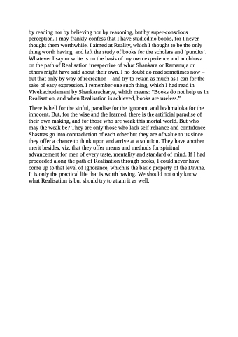 by reading nor by believing nor by reasoning, but by super-conscious perception. I may frankly confess that I have studied no books, for I never thought them worthwhile. I aimed at Reality, which I thought to be the only thing worth having, and left the study of books for the scholars and ‘pundits’. Whatever I say or write is on the basis of my own experience and anubhava on the path of Realisation irrespective of what Shankara or Ramanuja or others might have said about their own. I no doubt do read sometimes now – but that only by way of recreation – and try to retain as much as I can for the sake of easy expression. I remember one such thing, which I had read in Vivekachudamani by Shankaracharya, which means: “Books do not help us in Realisation, and when Realisation is achieved, books are useless.”