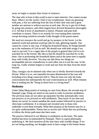 Under Sahaj Marg system of training we start from dhyan, the seventh step of Patanjali yoga, fixing our mind on one point in order to practise meditation. The previous steps are not taken up separately but they automatically come into practice as we proceed on with meditation. Thus much of our time and labour are saved. In certain sansthas the usual routine followed for practice is often kept confidential. It is released and revealed only to those who undertake to join them formally. What their purpose at the bottom may be, is not quite understandable. Nature has no secrets and I think that one professing to follow the divine path must also have none.