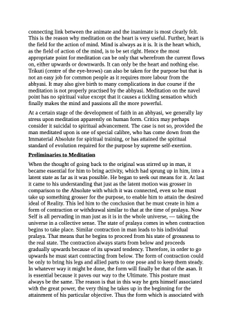 connecting link between the animate and the inanimate is most clearly felt. This is the reason why meditation on the heart is very useful. Further, heart is the field for the action of mind. Mind is always as it is. It is the heart which, as the field of action of the mind, is to be set right. Hence the most appropriate point for meditation can be only that wherefrom the current flows on, either upwards or downwards. It can only be the heart and nothing else. Trikuti (centre of the eye-brows) can also be taken for the purpose but that is not an easy job for common people as it requires more labour from the abhyasi. It may also give birth to many complications in due course if the meditation is not properly practised by the abhyasi. Meditation on the navel point has no spiritual value except that it causes a tickling sensation which finally makes the mind and passions all the more powerful.