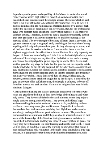 depends upon the power and capability of the Master to establish a sound connection for which high calibre is needed. A sound connection once established shall continue until the disciple secures liberation which in such cases is not a far off matter to be attained after numerous lives. In fact, if a disciple is initiated in the right sense as mentioned above by a guru of high calibre the question of breaking off can never arise. But, for the professional gurus who perform mock initiations to serve their purpose, it is a matter of constant anxiety. Therefore, in order to keep a disciple permanently in their grip, they proclaim it as a divine dictate that he shall be courting all the miseries of hell if he ever thought of breaking off from them at any time. The ignorant masses accept it as gospel truth, trembling at the very idea of doing anything which might displease their guru. So they always try to put up with all their atrocities in passive submission. I am sure that there is not the slightest suggestion to this effect found in our Shastras. It is only ingenuity on the part of these teachers of religion. I hold it to be the birthright of every man to break off from his guru at any time if he finds that he has made a wrong selection or has misjudged the guru’s capacity or worth. He is free to seek another guru if at any stage he finds that his guru has not the capacity to take him beyond what he has already acquired. On the other hand, a conscientious guru must himself, under the circumstances, direct his disciple to seek another more advanced and better qualified guru, so that the disciple’s progress may not in any way suffer. This is the sacred duty of a true, selfless guru. If, however, permission to break off sought for by the disciple, is denied by the guru on account of his selfish motives, the disciple is at liberty to break off from him at once and seek another. No moral or religious law ever forbids him from doing so.