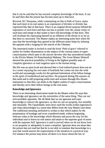 Revered. KC Narayana, while commenting on this in Path of Grace, states that each knot in its real nature is an expression of divinity or divinity has expressed like that in that knot. There is an original divine purpose behind the expression of each knot and thus one has to ponder over the causal centre of each knot and merge in that realm to have full knowledge of that knot. This will facilitate his expressing himself as an offshoot of the divine in so far as that knot is concerned. The Master makes an interesting point here when He says that the knowledge thus gained at the different states helps by infusing the aspirant with a longing for the search of the Ultimate.